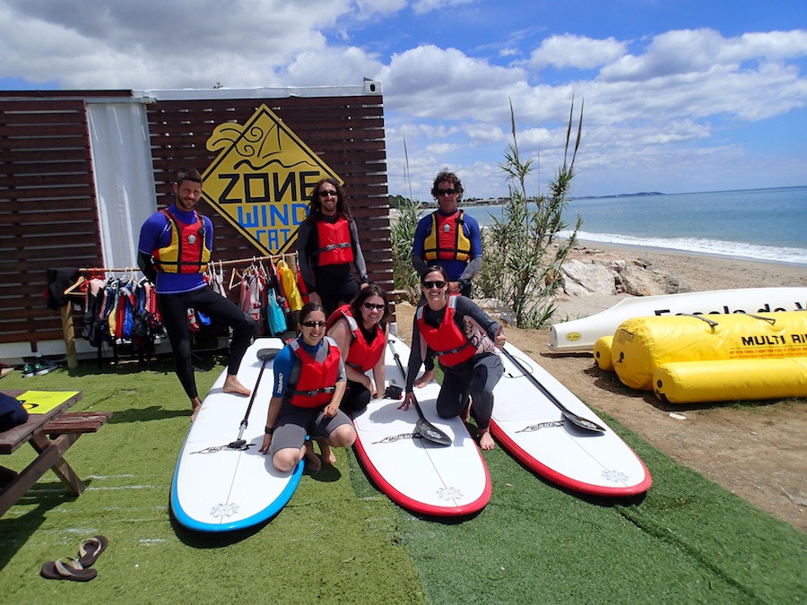Agarras la tabla y el remo, entras al agua, esperas a que baje la última ola, y te montas en la tabla. Fácilmente, con un poco de fuerza en los brazos, te subes de rodillas a la tabla. Todo es estable y sencillo. Tras remar algunos metros y dar un rodeo de reconocimiento, estamos listos para ponernos en pie sobre la tabla. Tomas el remo con las dos manos, te pones en pie, miras al horizonte como te ha indicado el monitor antes y… ¡Síiii, lo has conseguido, estás de pie encima de la tabla! Lástima que la alegría te distraiga de tu obligación de remar y… ¡¡Plof!! Caigas de nuevo al agua.
